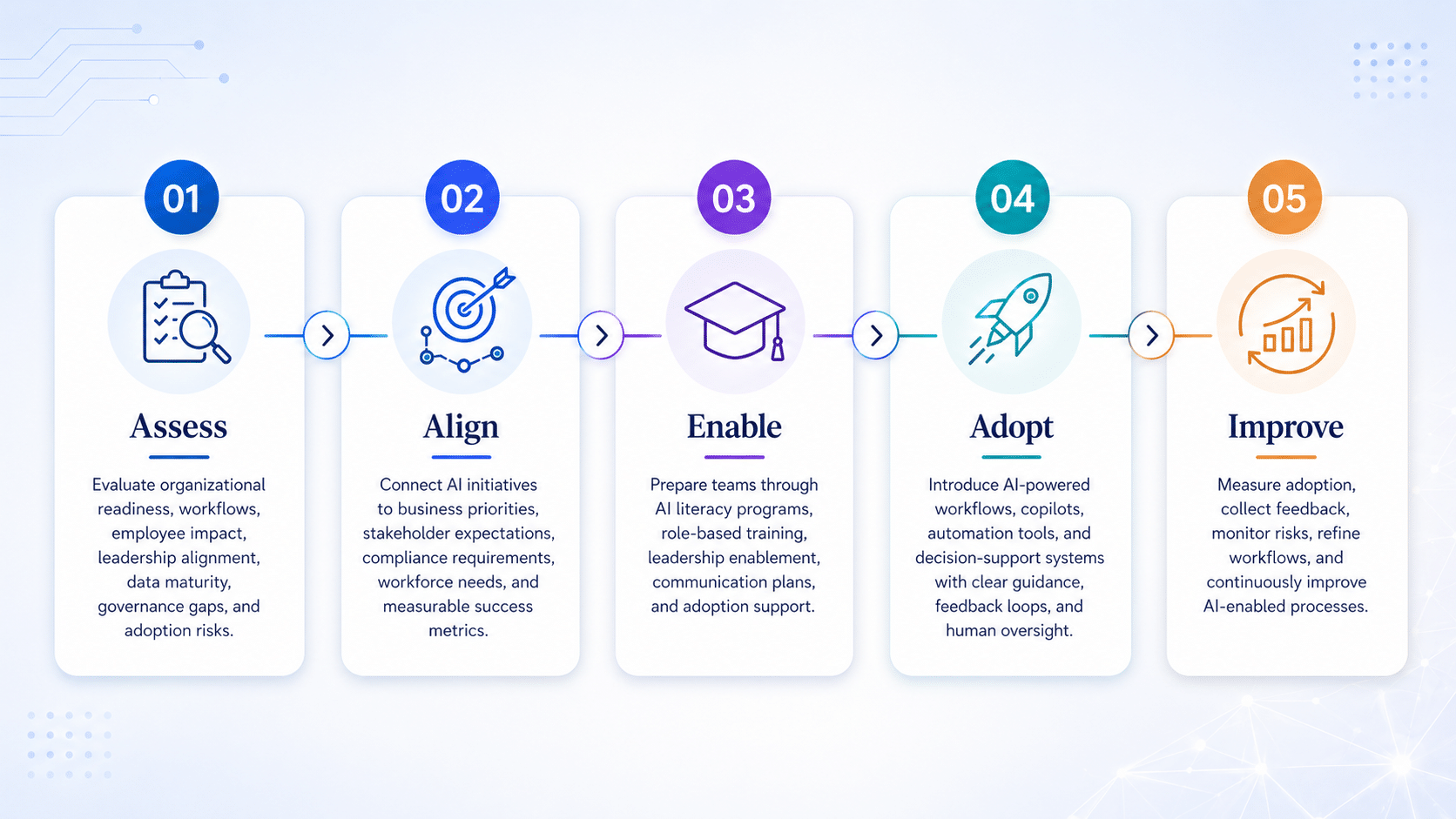 Clear communication, training, governance, and workflow redesign help teams transition smoothly from existing processes to AI-assisted ways of working.